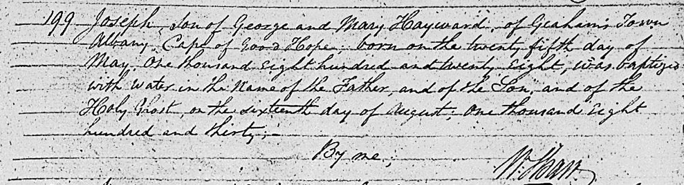 - Joseph Hayward. Born 25 May 1828. Baptised 16 August 1830 in South Africa, aged 2 years.