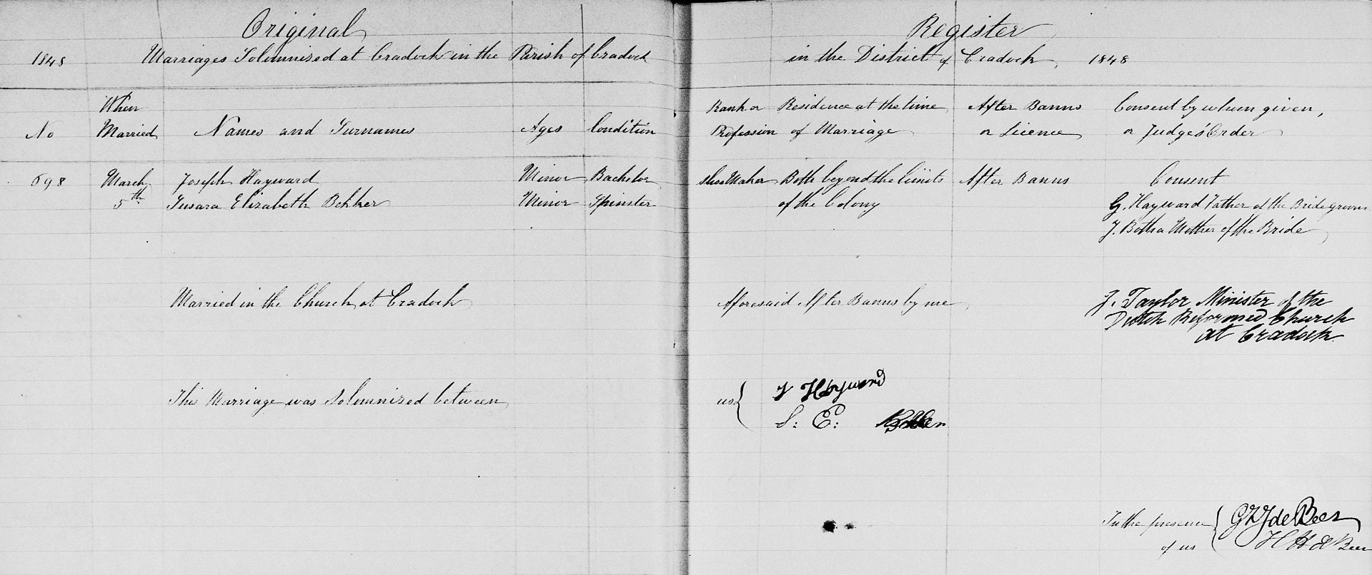 Other researchers suggest George and Mary Ann had another son Joseph, born in 1832, but I have been unable to trace any record of him. Joseph Hayward married Susara Elizabeth Bekker on 5 March 1848 at Craddock Eastern Cape, South Africa. They were both minors. Depending on whether Joseph had been born in 1828 or 1832 he would have been either 20 or 16 years old. Joseph was a shoemaker, so 20 seems more likely! They are described as residing "both beyond the limits of the colony".