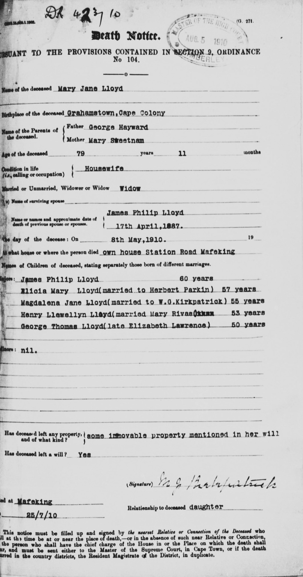 James Phillip Lloyd died on 17 April 1887. Mary Jane Lloyd died on 8 May 1910 in Station Road, Mafaking.