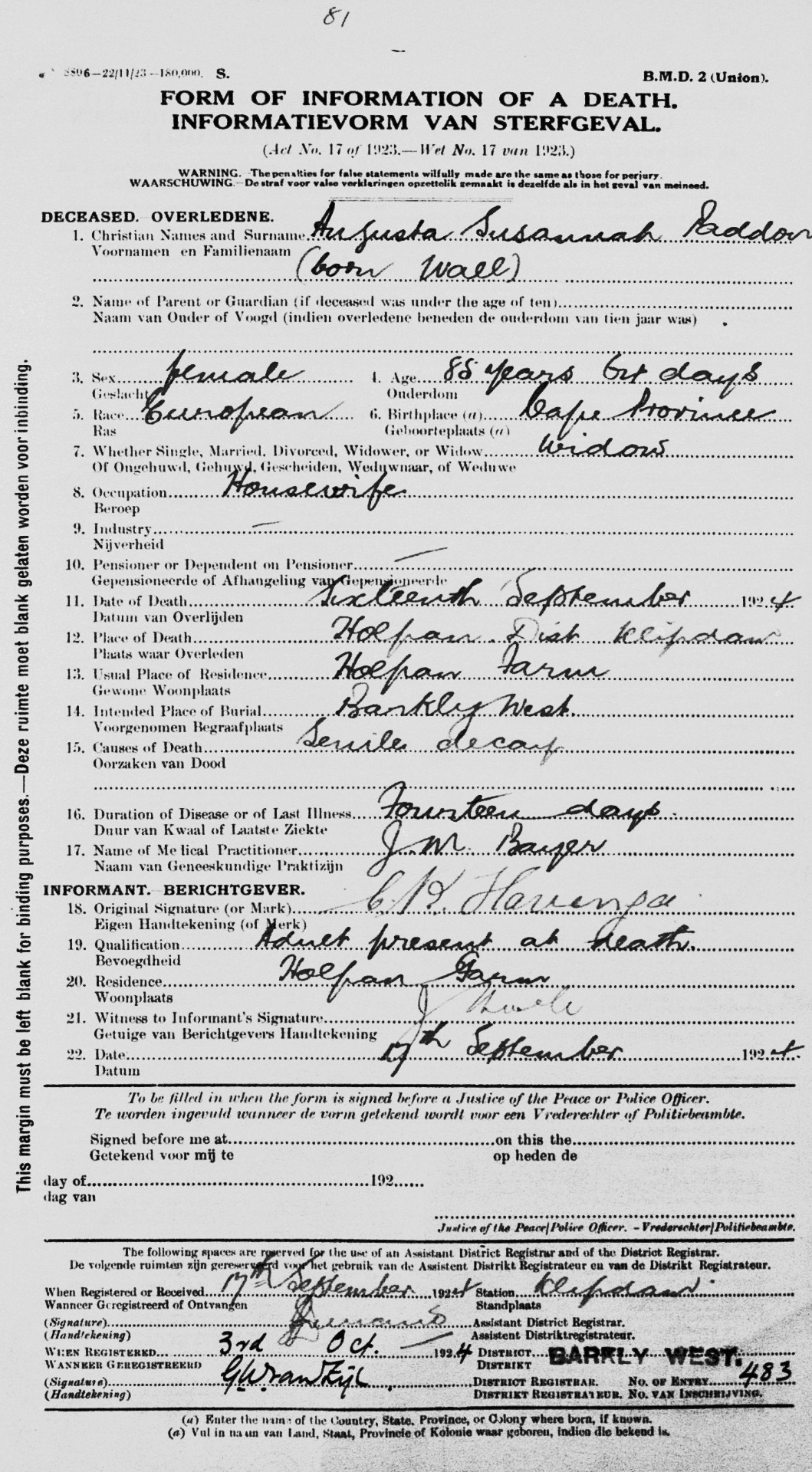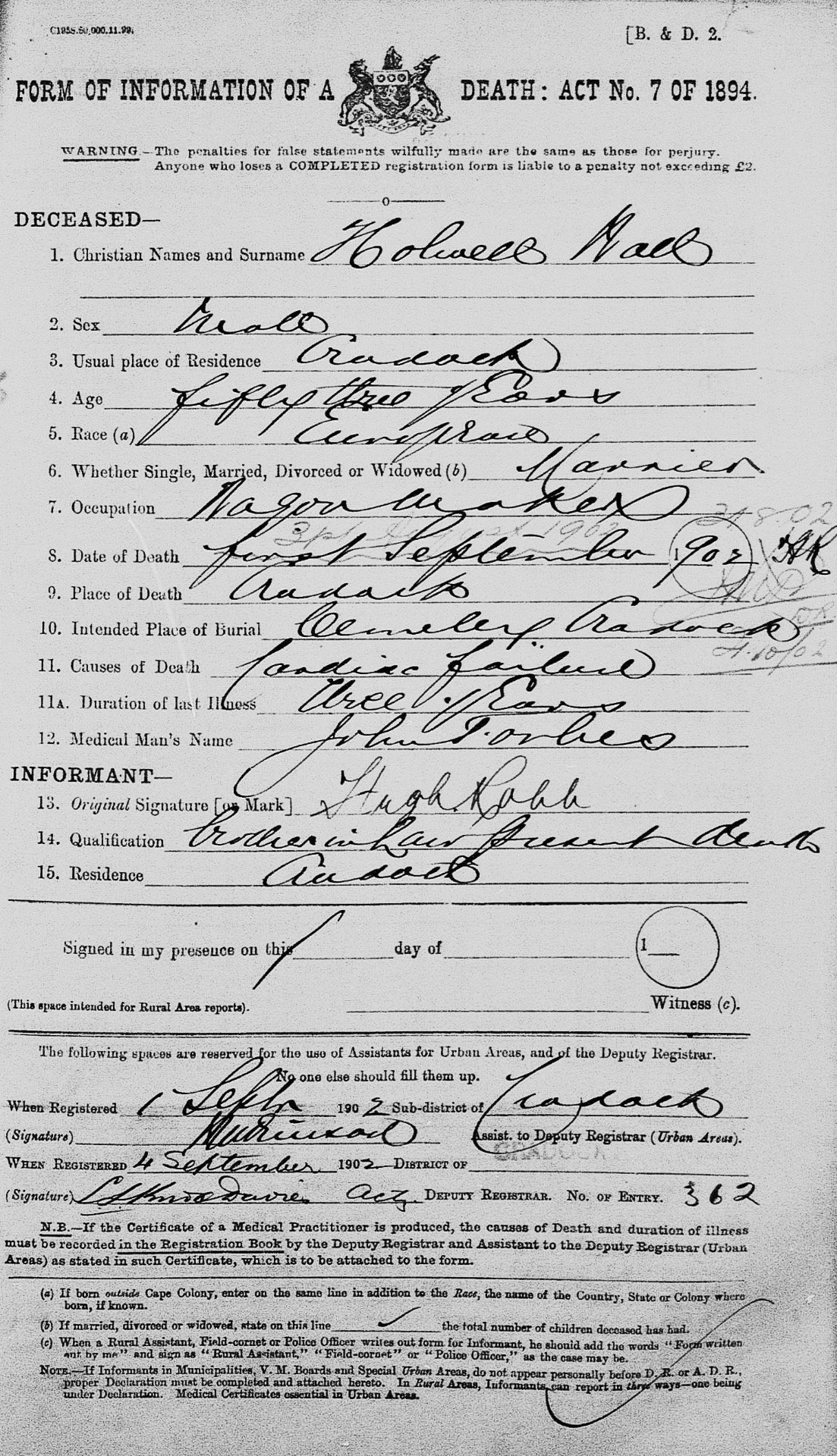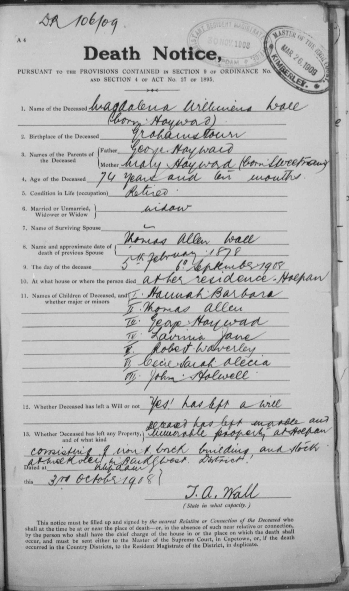 Thomas Wall died on 5 February 1878 aged 44 years. He was a "diamond digger". The death notice states that he leaves "a few cattle, wagon, carts and tents", Magdalene Wall died on 6 September 1908 aged 74 years old. The death states that "the deceased has left movable and inmovable property at Holpan" "consisting of a non-brick building & stock......."