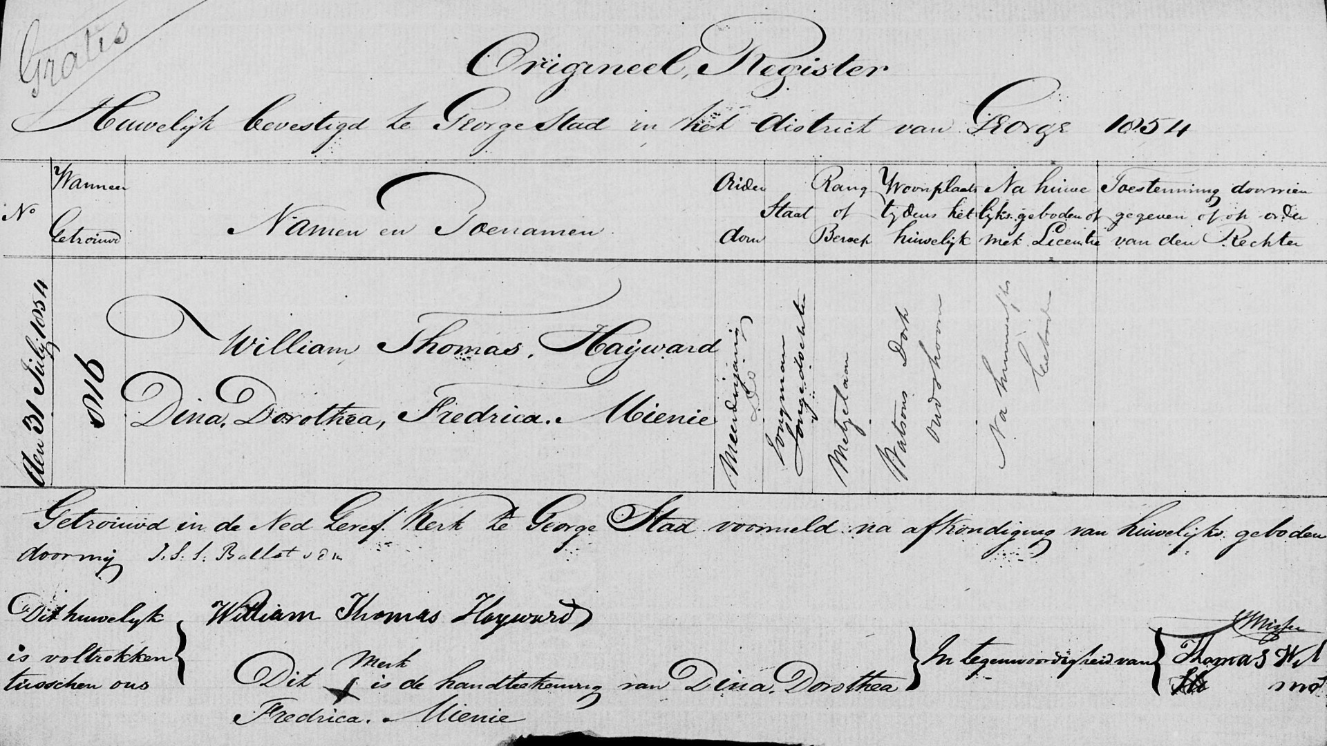 George and Mary Ann's son William Thomas Hayward married Dina Dorethea Fredericka Mienis on 31 July 1854 at George, Western Cape, South Africa. William signed the register whereas Dina was only able to make her mark. This marriage certificate and most of the others included below, along with most of the death notices were posted on Ancestry.co.uk by Keith McPheeters, who must take credit for most of what follows.