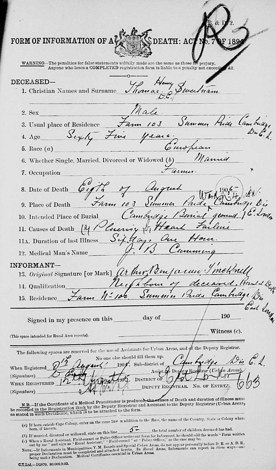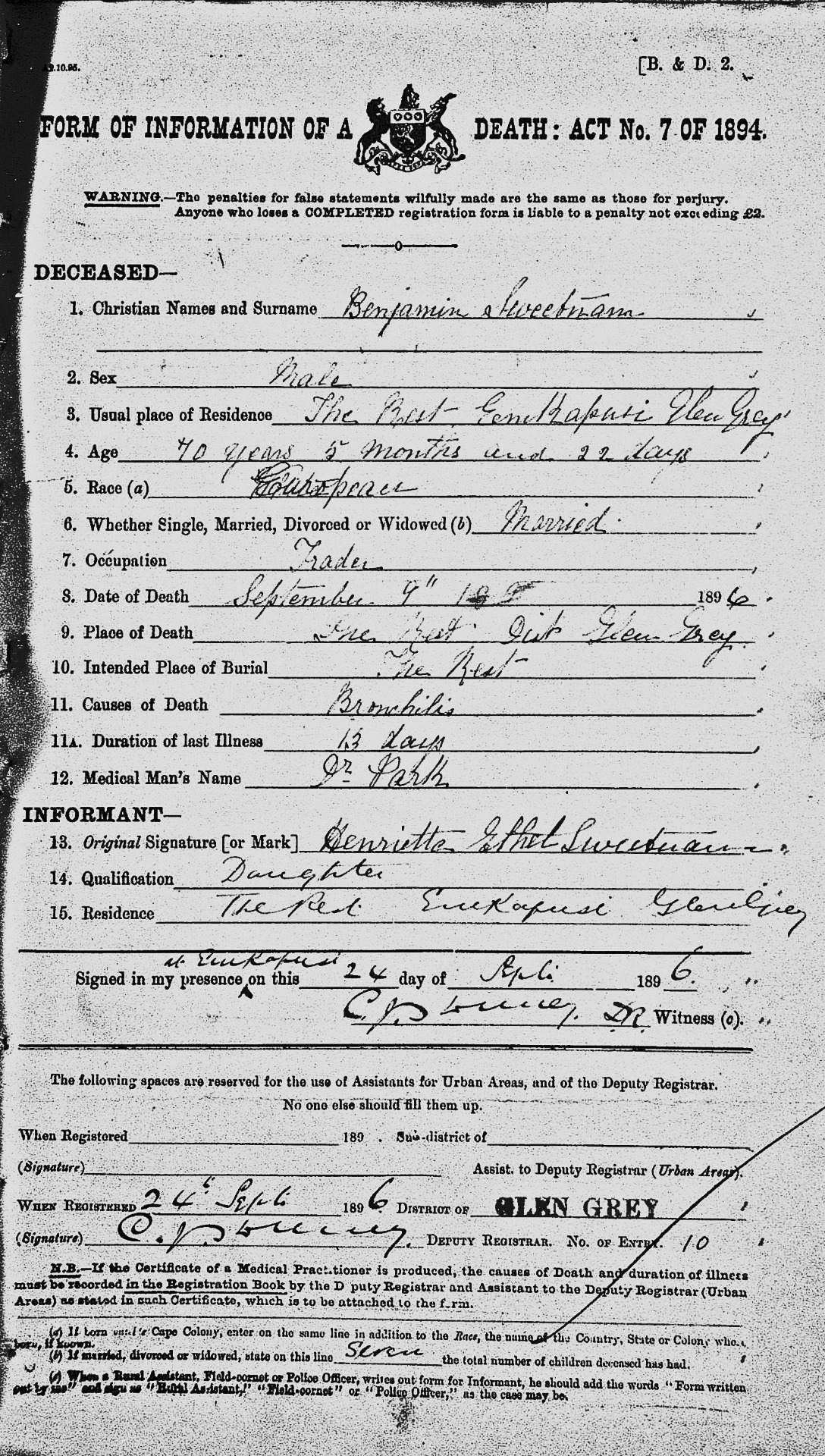 Benjamin Sweetnam died on 9 September 1896 at Ladyfrere, South Africa, aged 70 years, 5 months and 22 days. .