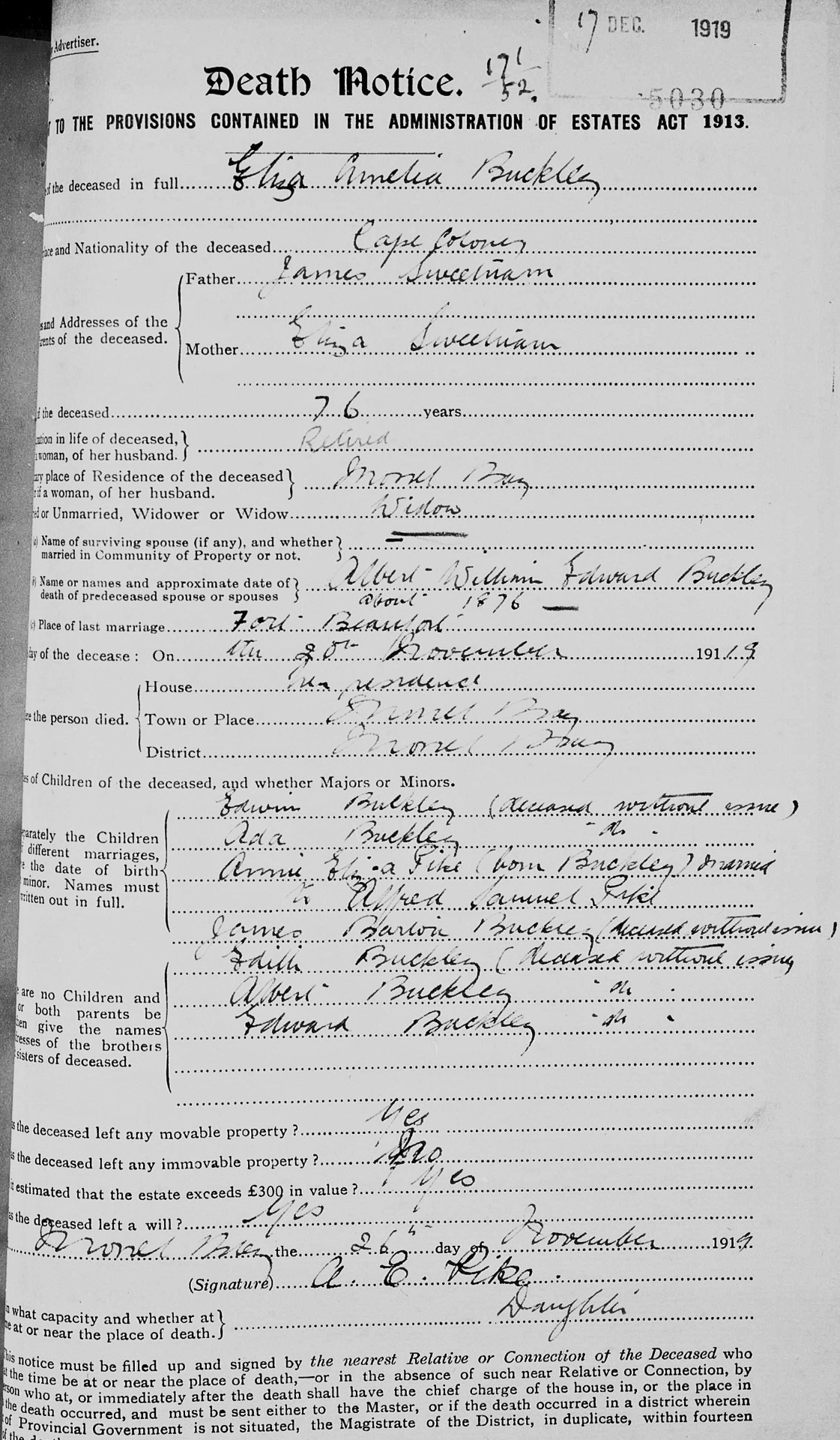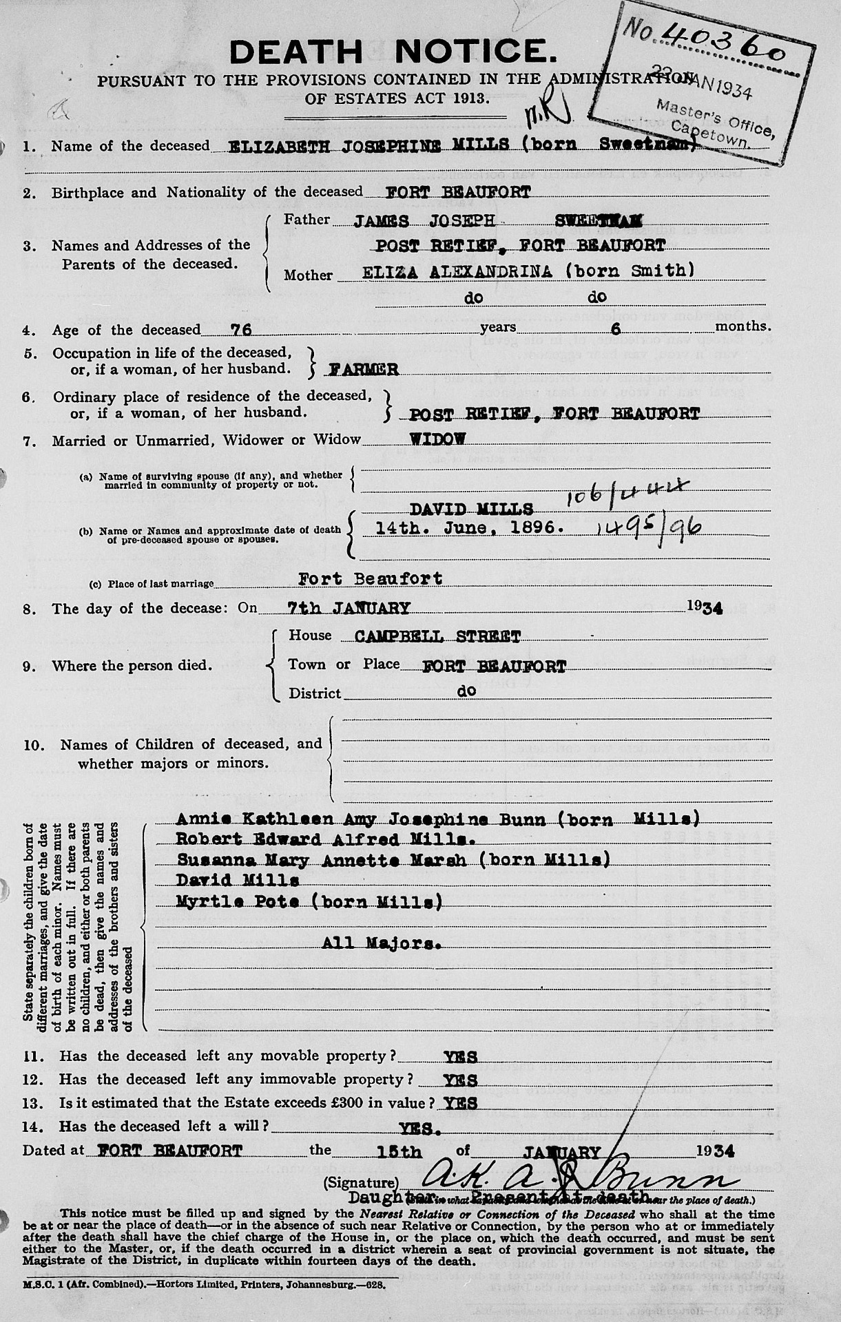 Annie died on 23 June 1914 in Dordrecht, Wodehouse, Eastern Cape. Cecil George Massey-Hicks died on 6 June 1949 in Johannesburg.