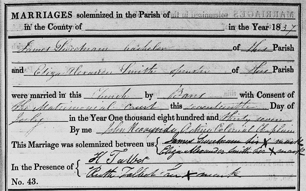 Thomas and Jenny's son James Sweetnam married Eliza Alexandrina Smith on 17 July 1837 at St Georges, Grahamstown, South Africa. both were only able to make their mark. The witnesses were H Talbot and Ruth Talbot (see below).