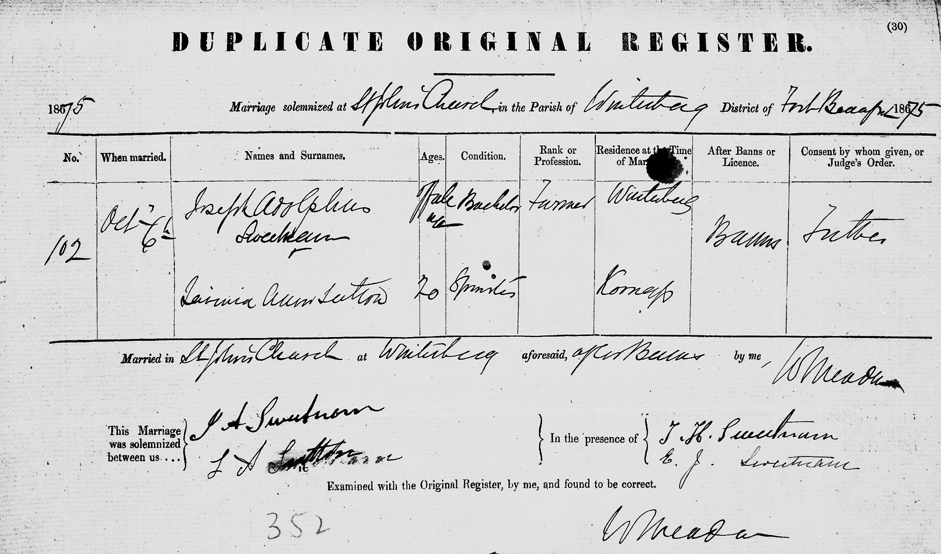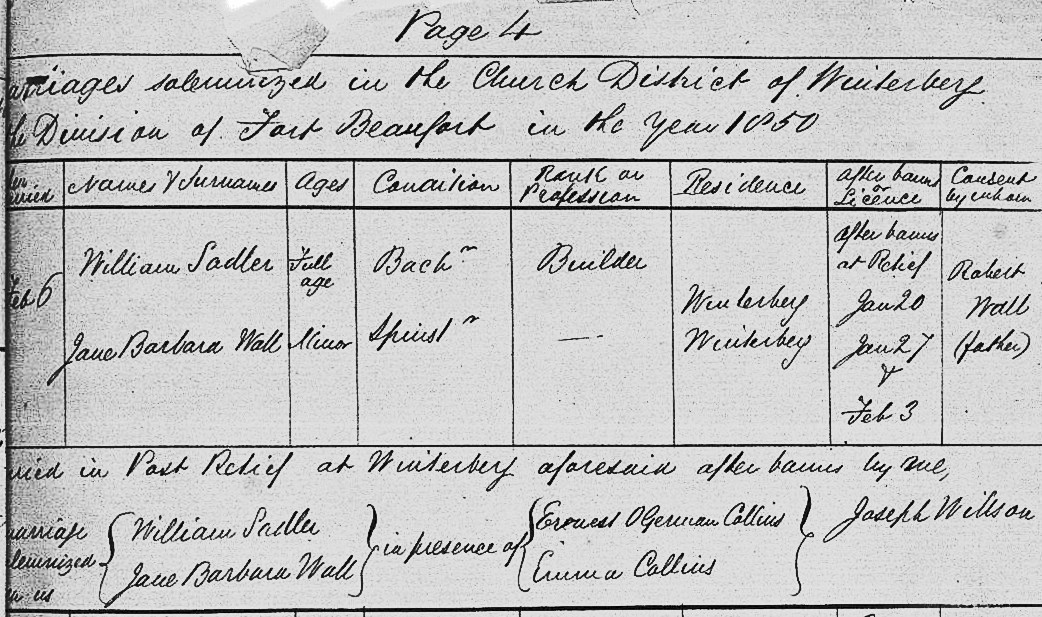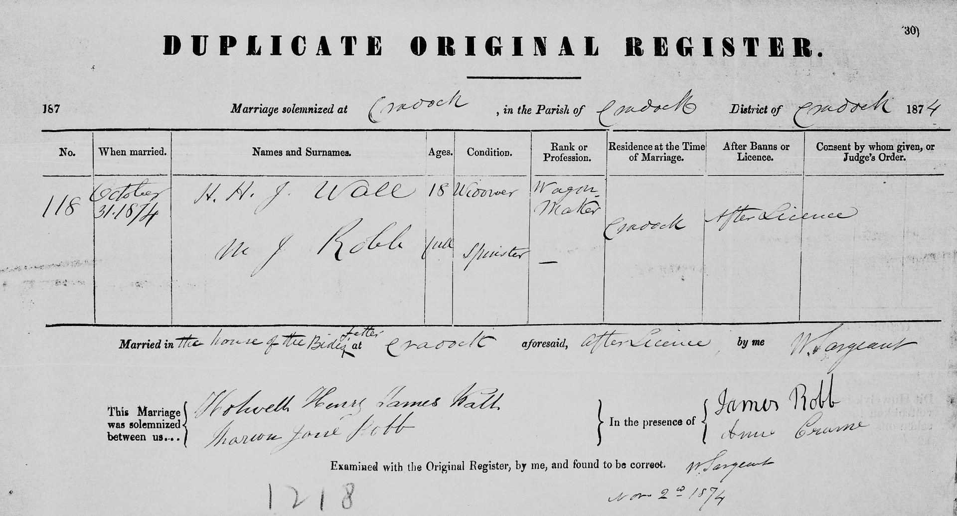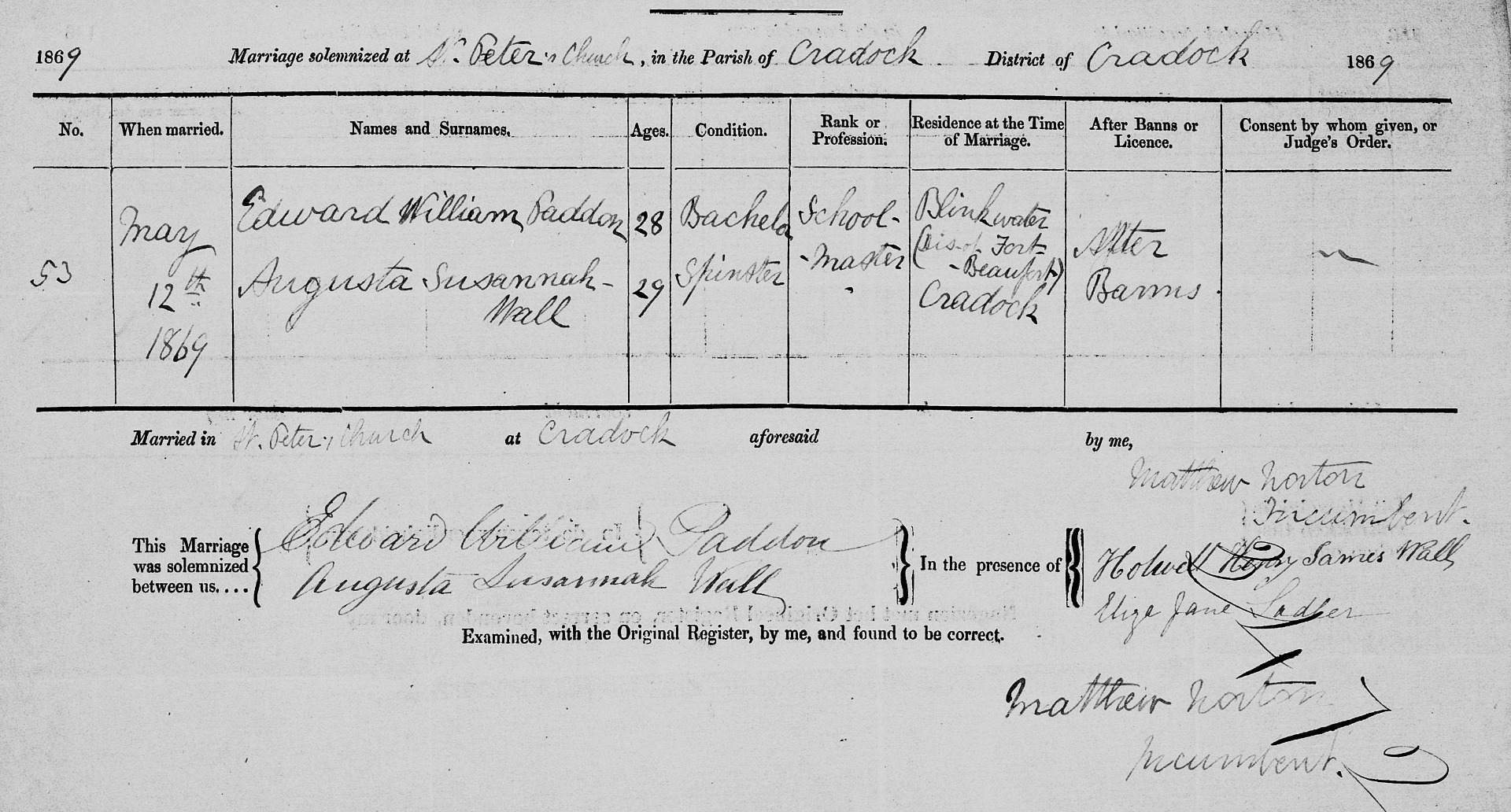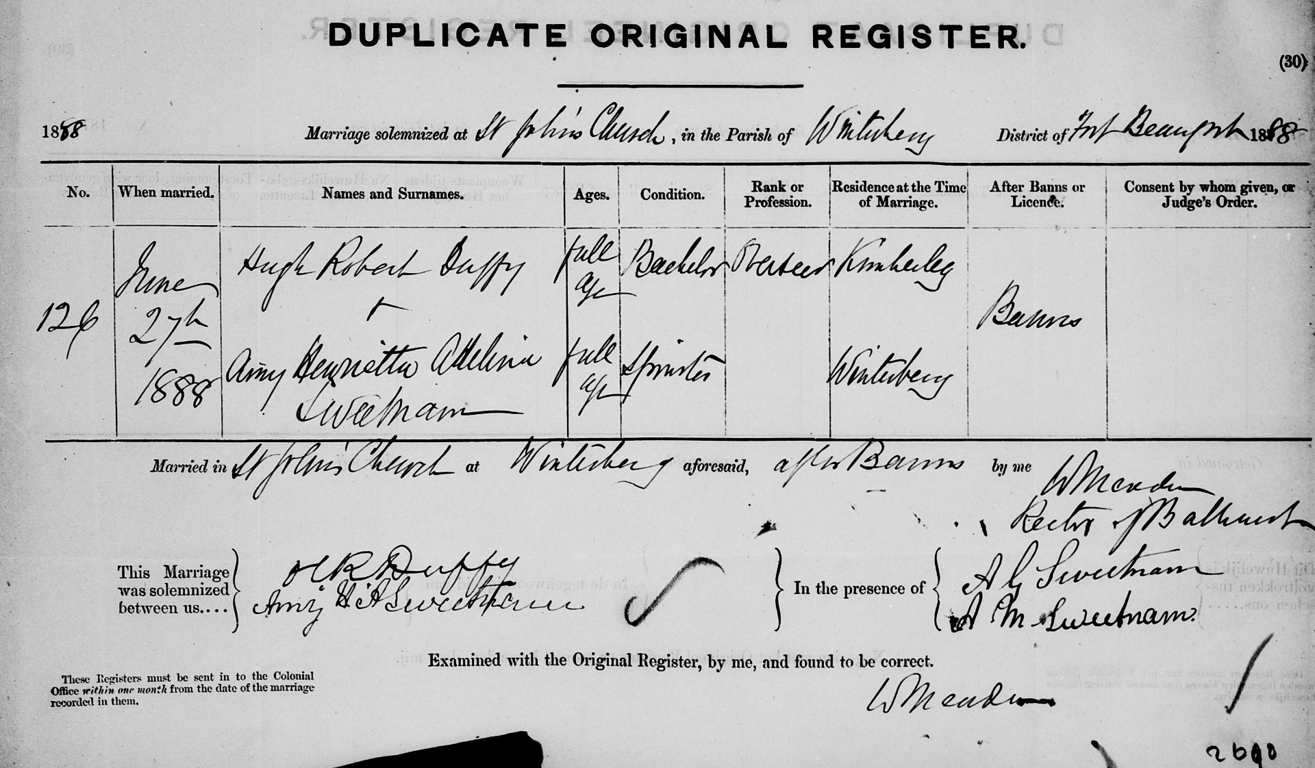 Benjamin and Henrietta's daughter Alice Jeanette Evelyn Sweetnam married Edward Henry James on 28 April 1880 at Rooipoort, Dordrecht, Cape, South Africa. Edward was a farmer of full age from Snow Hill. Alice was 16 years and 5 months old and they married with their parents consent! They both signed the register.