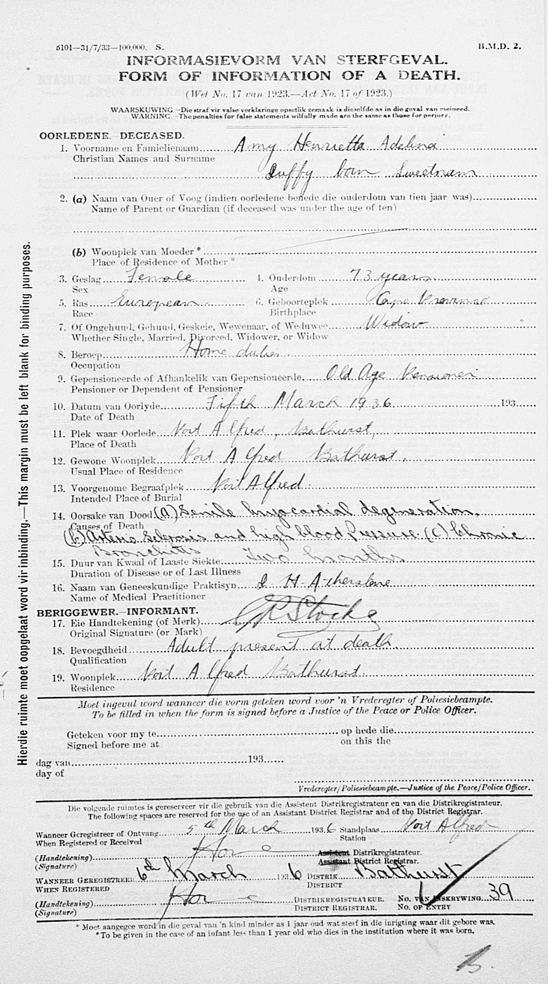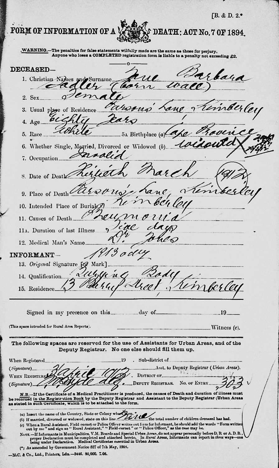 Magdalene died on 21 December 1900 in Glen Grey, Cape Province aged just 25 years. The cause of death was "abscess on spleen". Albert died on 8 March 1957 in Kuruman.