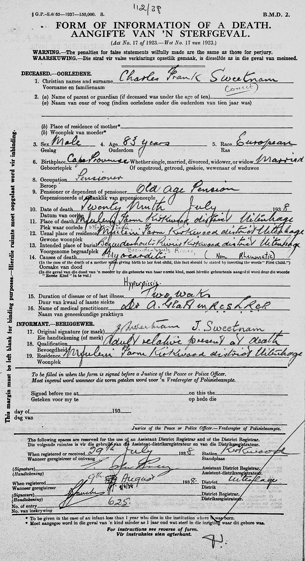 - Charles Frank Sweetnam. Born 15 October 1855 in Post Retief, Winterberg.