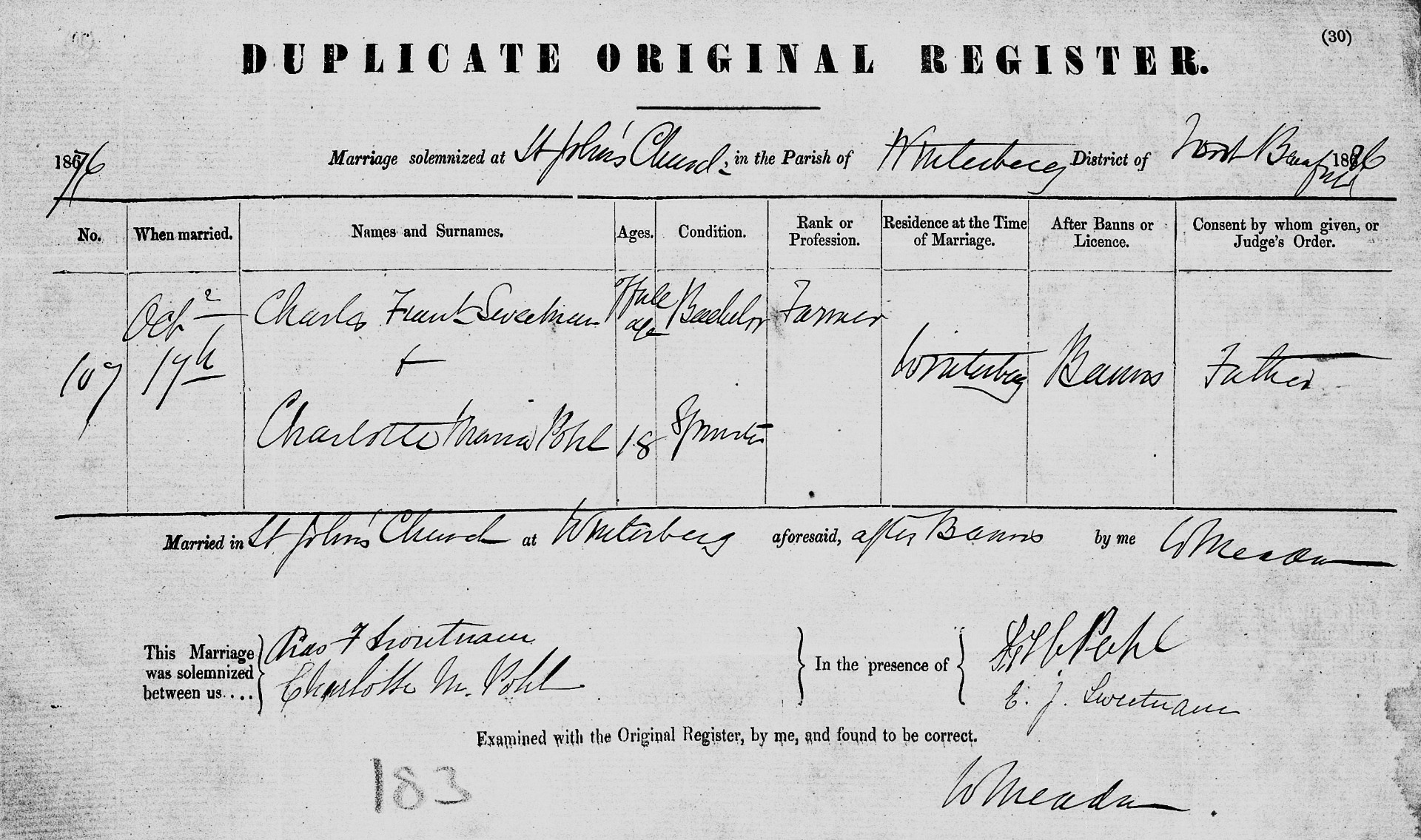 - Joseph Adolphus Sweetnam. Born 30 August 1850 in Winterberg. Baptised 24 November 1850 in Winterberg.