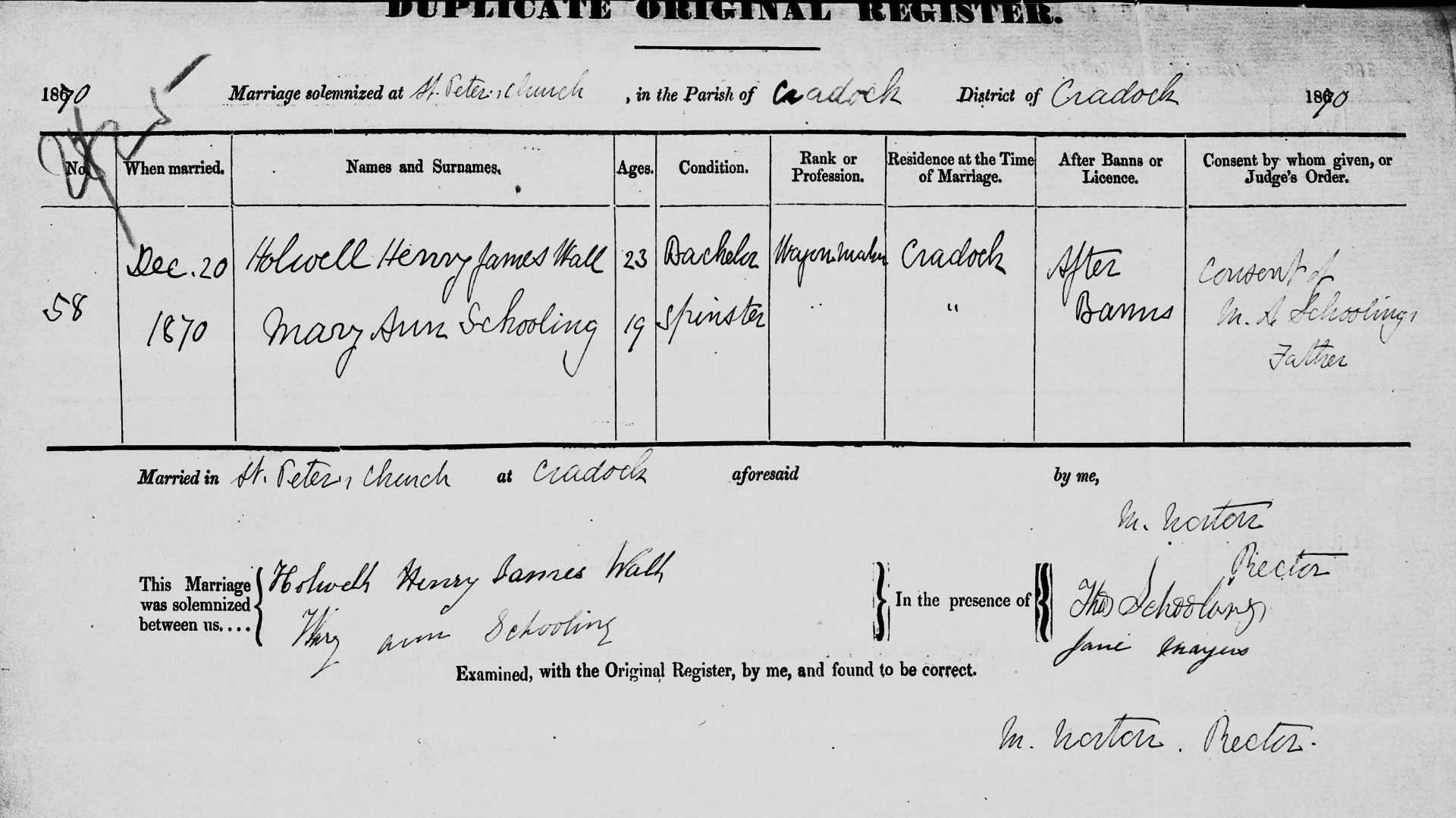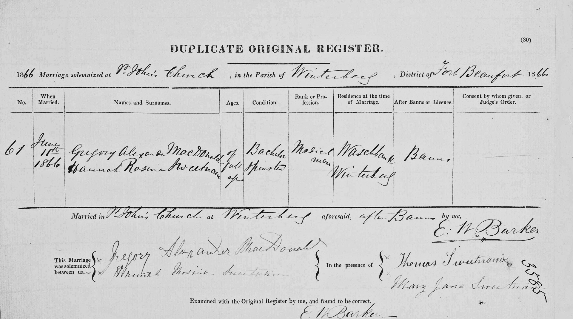 George and Mary Ann's daughter Magdalene Wilhelmina Hayward married Thomas Allen Wall in 1854. Thomas was born in 1834, the son of Mary Ann's sister Hannah Sweetnam who married Robert Wall on 30 June 1832 at St George's, Grahamstown (see below) so this was a marriage of first cousins. Thomas and Magdalene had eight children
