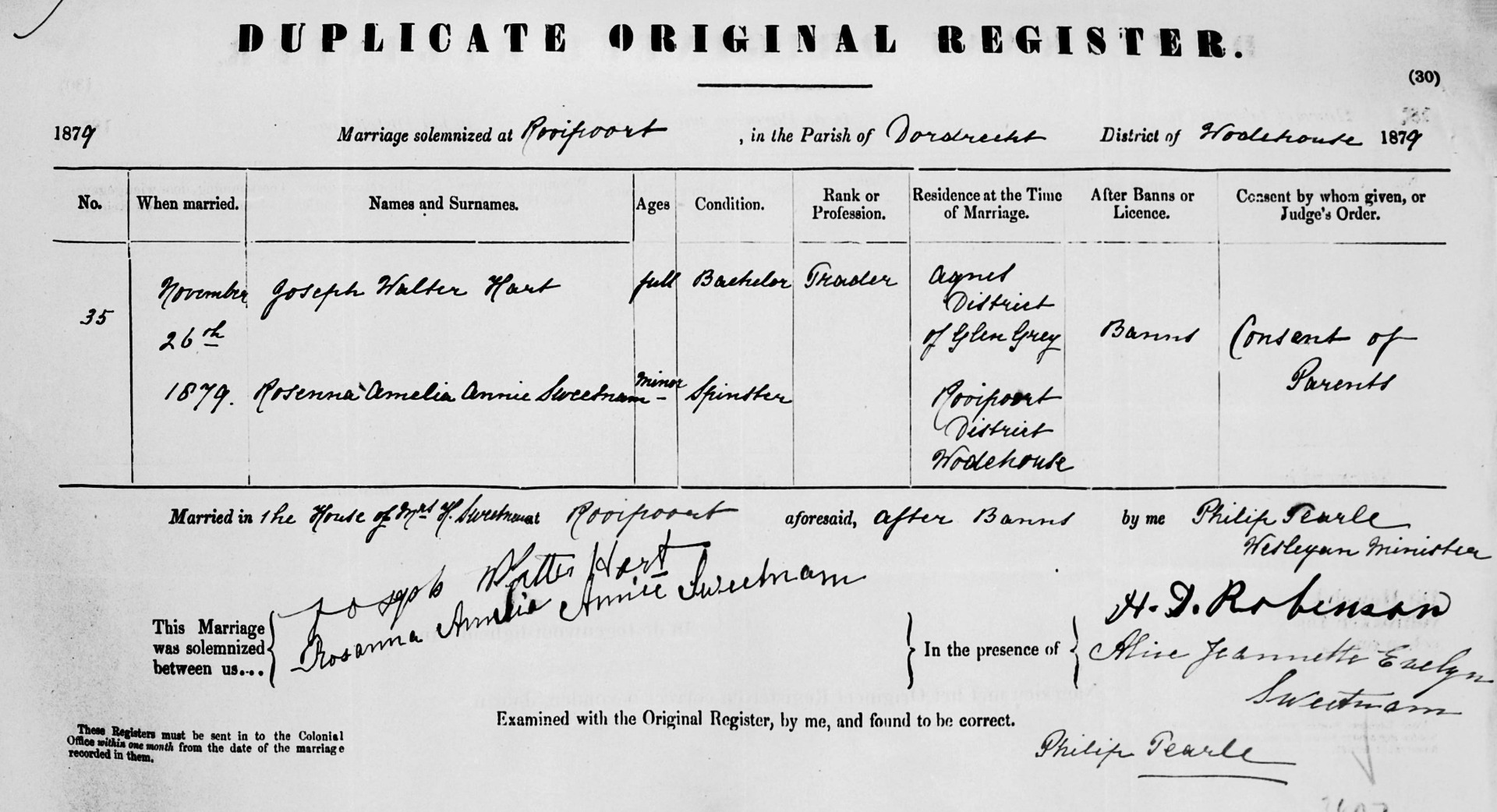Benjamin and Henrietta's daughter Rosannah Amelia Anne Sweetnam married Joseph William Hart on 26 November 1879 in Dordrecht, Eastern Cape, South Africa. Joseph was of full age, a trader. Rosanna was a minor marrying with the consent of her parents.
