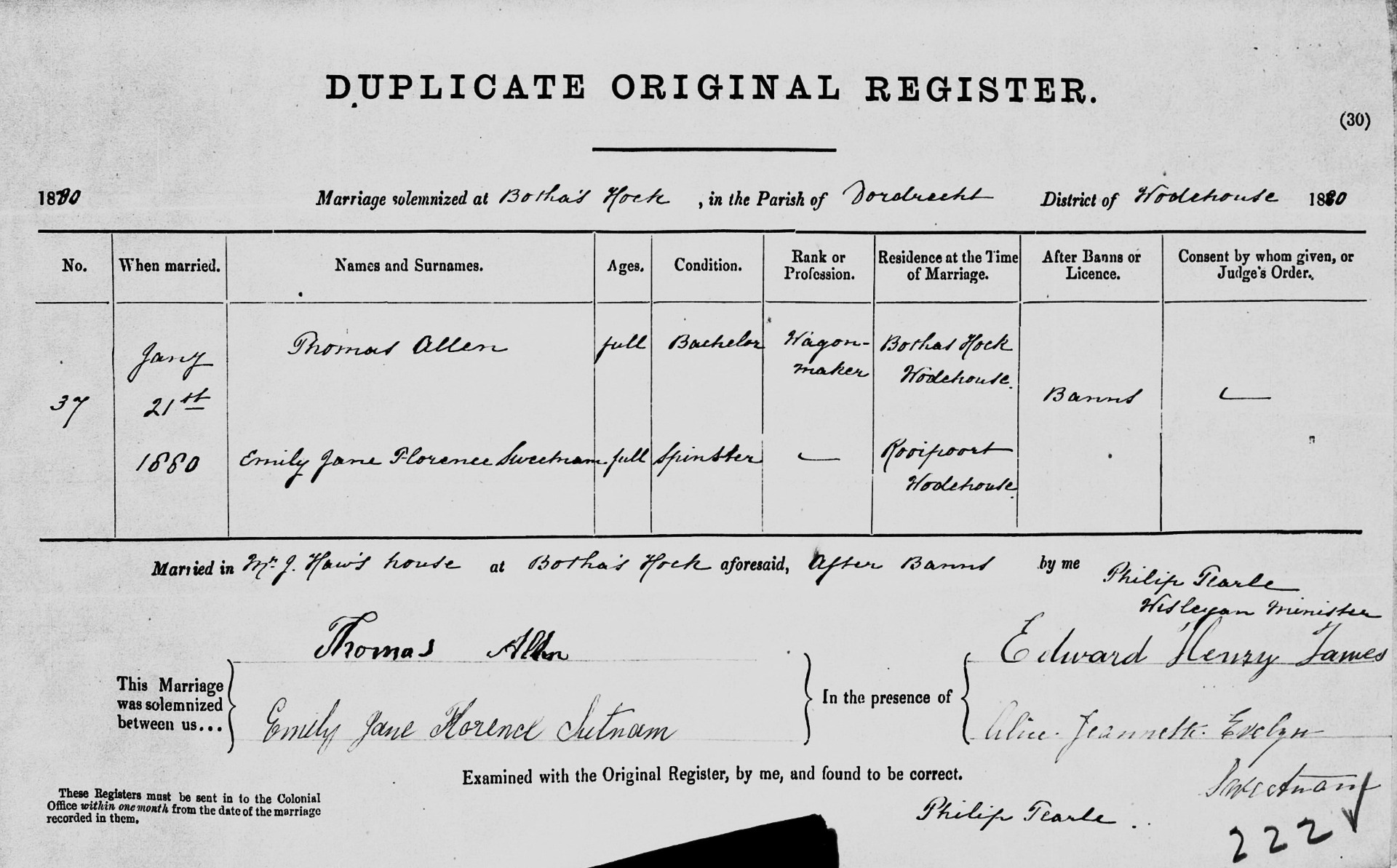 Benjamin and Henrietta's daughter Emily Jane Florence Sweetnam married Thomas Allen on 21 January 1880 in Dordrecht, Cape Of Good Hope. They were both of full age. Thomas was a wagon maker.