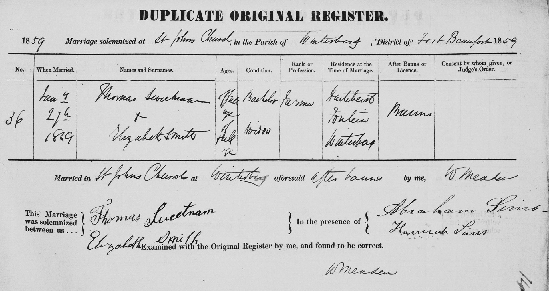 Thomas married Elizabeth Smith on 27 May 1869 at St John's Church, Winterberg. They were both of full age. Thomas was a farmer. Elizabeth was a widow,