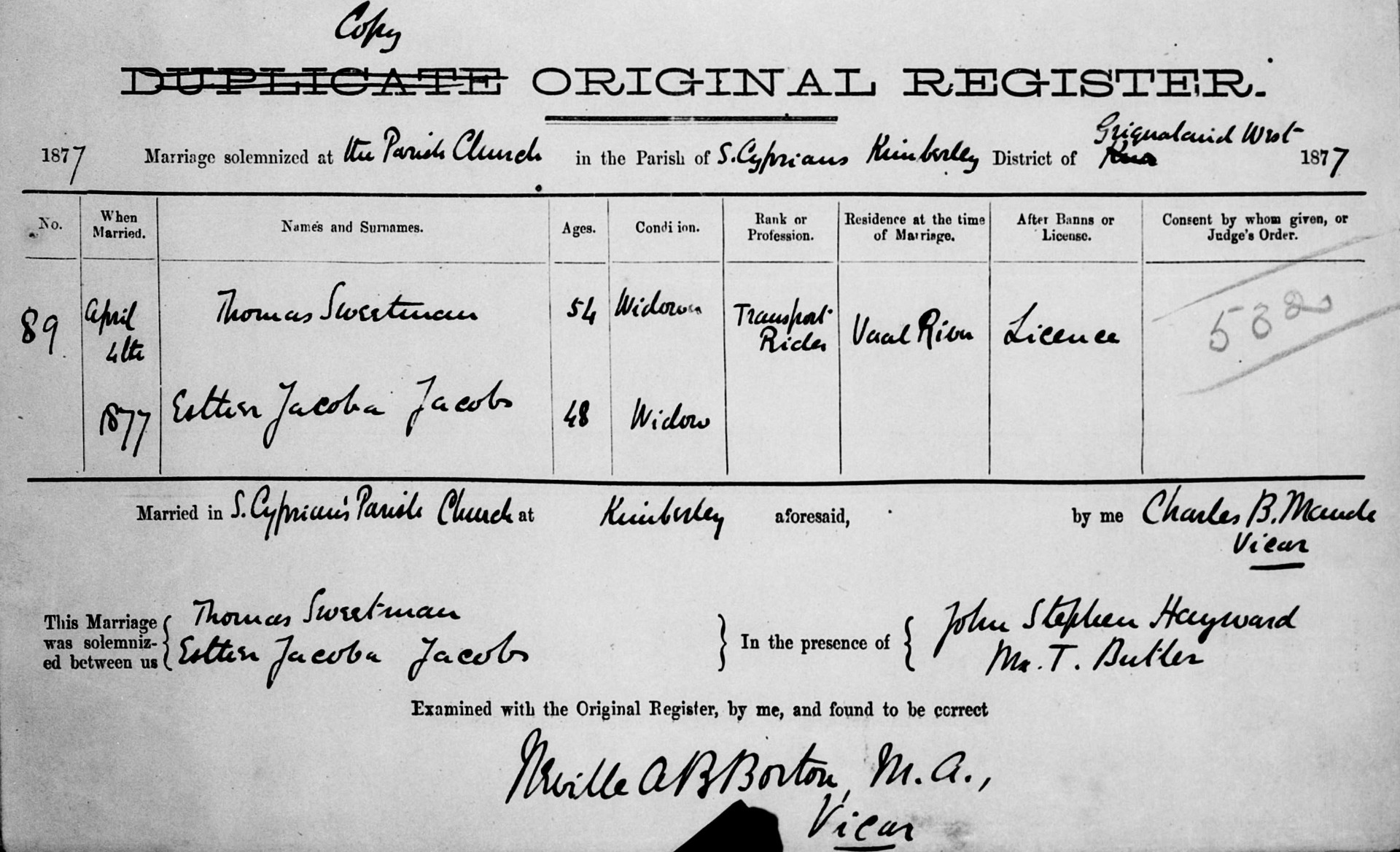 Thomas married again, on 4 April 1877 in St Cyprians, Kimberley. His second wife was Esther Jacoba Jacobs. Thomas was a 54 year old widower, a transport rider. Esther, aged 48 was a widow.