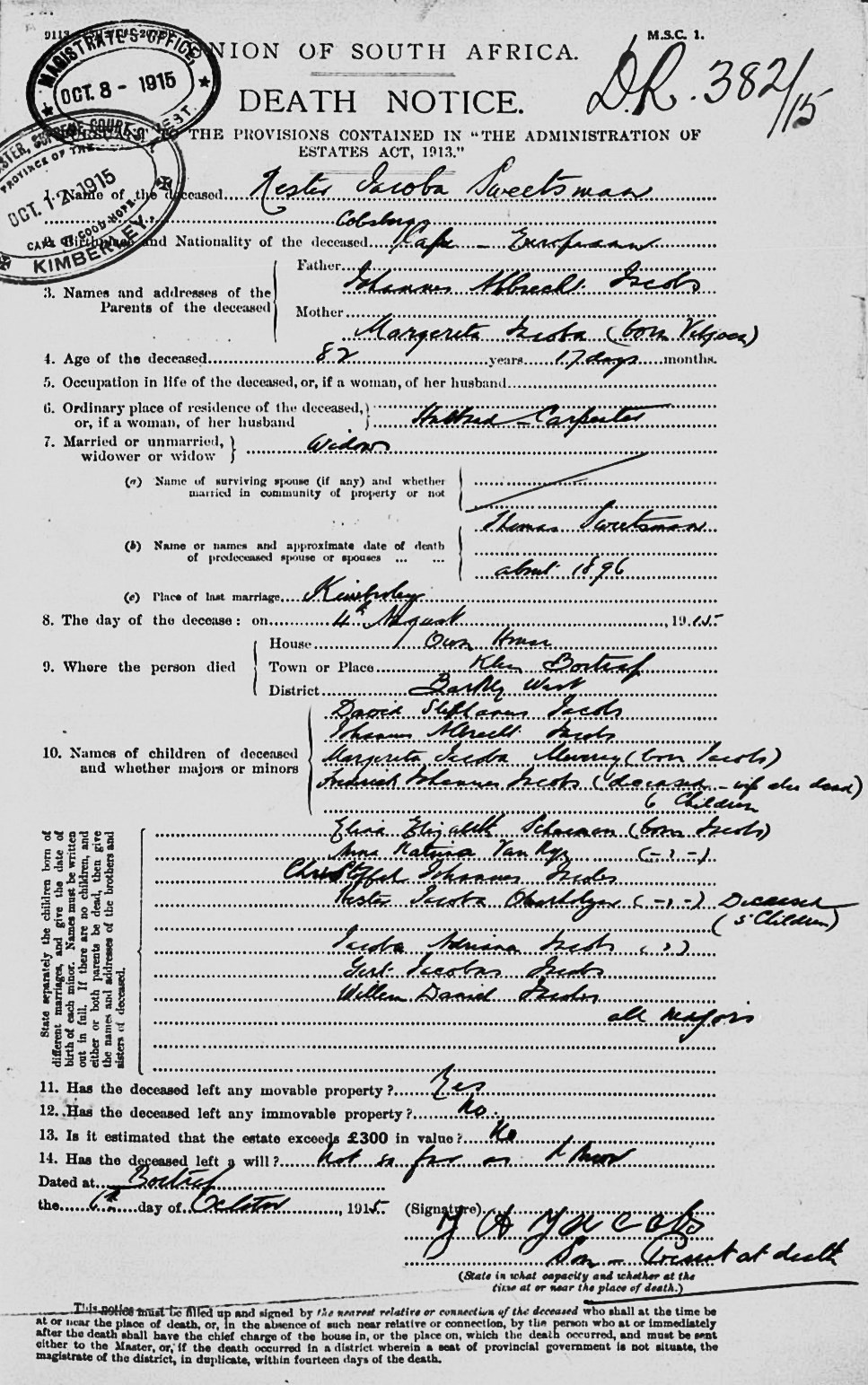 Esther Jacoba Jacobs' first husband had been Frederick Johannes Jacobs and they had married on 16 August 1852 in Colesberg. They had twelve children before Frederick died