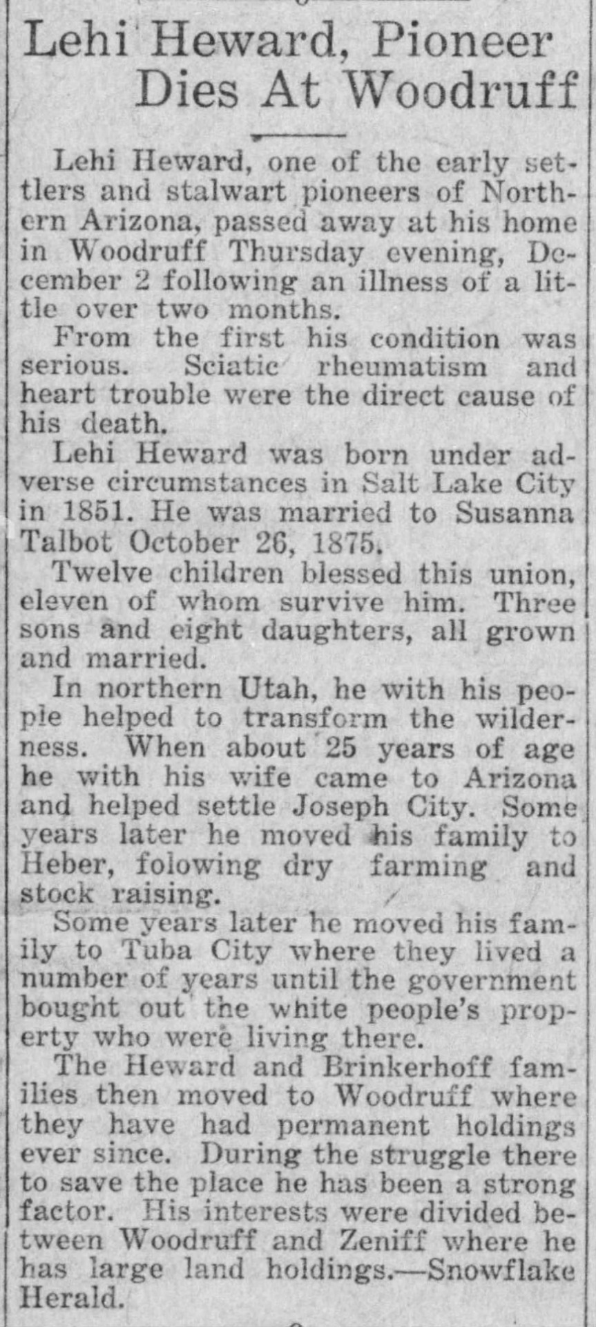 In 1920 Ruth was living at Newdale, Fremont, Idaho. In 1930 she was living with her son Hyrum at Newdale, Fremont, Idaho. In 1950 she was living at Shelley, Bingham, Idaho with her daughter now Ruth Blair, also a widow and one of her grandsons. Ruth Sweetnam Heward died on 11 June 1953 in Shelley, Bingham, Idaho. She was buried in Blackfoot, Bingham County.