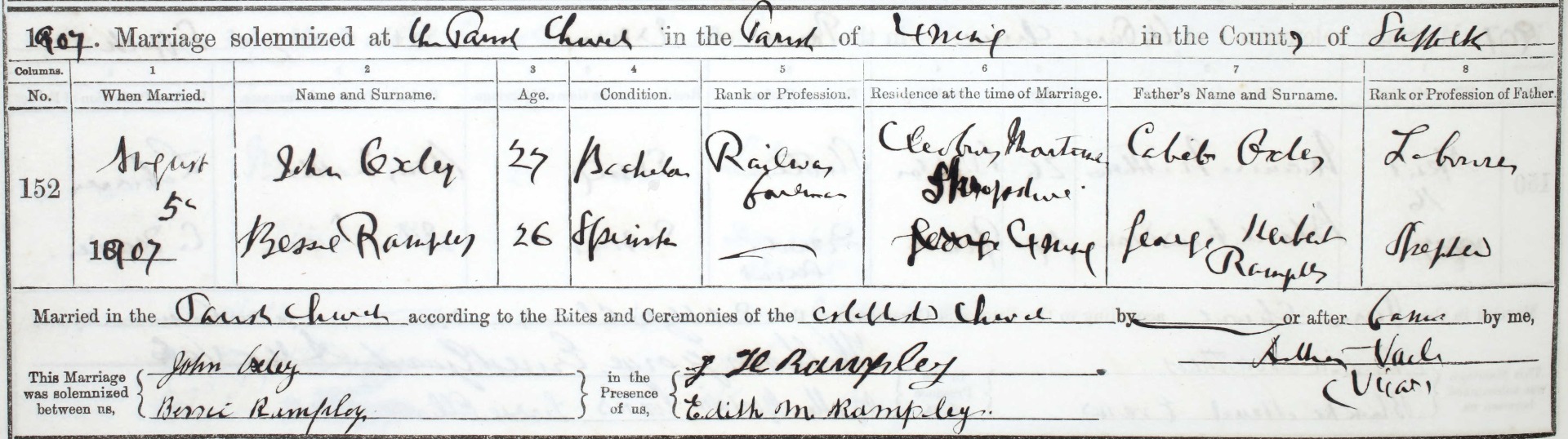 In 1891 Caleb and Emily's son John Oxley was boarding with 7 others at the home of John Marchant, railway foreman and his family at Bridge Street, Ashford, Kent. Aged 21 he was a carpenter and labourer. John married Bessie Rampley on 5 August 1907 in St Mary's, Exning. John was a 27 year old railway foreman, son of Caleb Oxley, labourer. Bessie was 26 years old, daughter of George Herbert Rampley, shepherd,