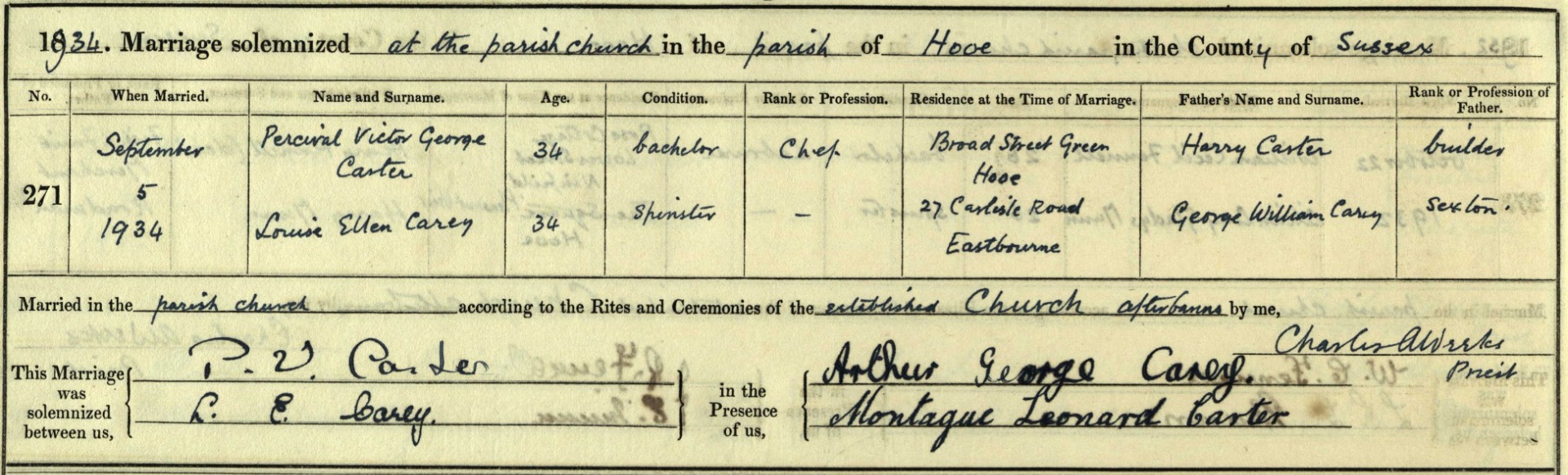In 1921 George and Ellen's daughter Louisa Ellen Carey, aged 20 was a domestic servant, but at the time that the census was taken was visiting her parents at Broad Street, Hooe. She married Percival Victor George Carter on 5 September 1934 in Hailsham. Percival was a 34 year old chef, from Broad Street Green, son of Henry Carter. builder. Louise, was also 34 years old, of 27, Carlisle Road, Eastbourne, daughter of George William Carey, sexton,