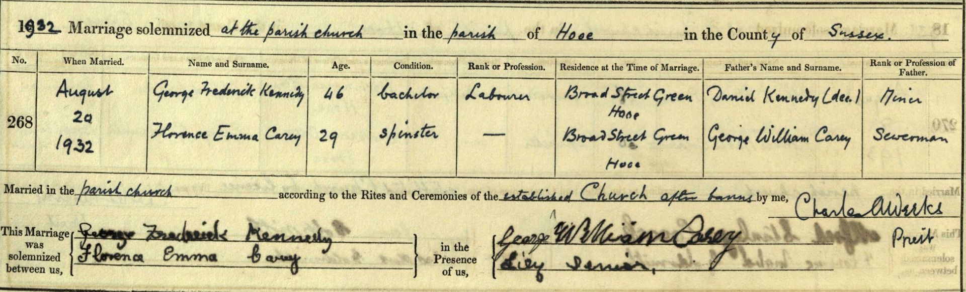 In 1921 George and Ellen's daughter Florence Emma Carey was a 18 year old domestic servant working for and living with William Poulton Glessing, a 51 year old farmer and his family at Howard's Lodge, Bexhill. Her sister Bertha. aged 26 was also working there. She married George Frederick Kennedy on 20 August 1932 in Hailsham. George was a 46 year old labourer, son of David Kennedy (deceased), miner. Florence was 29 years old, daughter of George William Carey, sewer man.