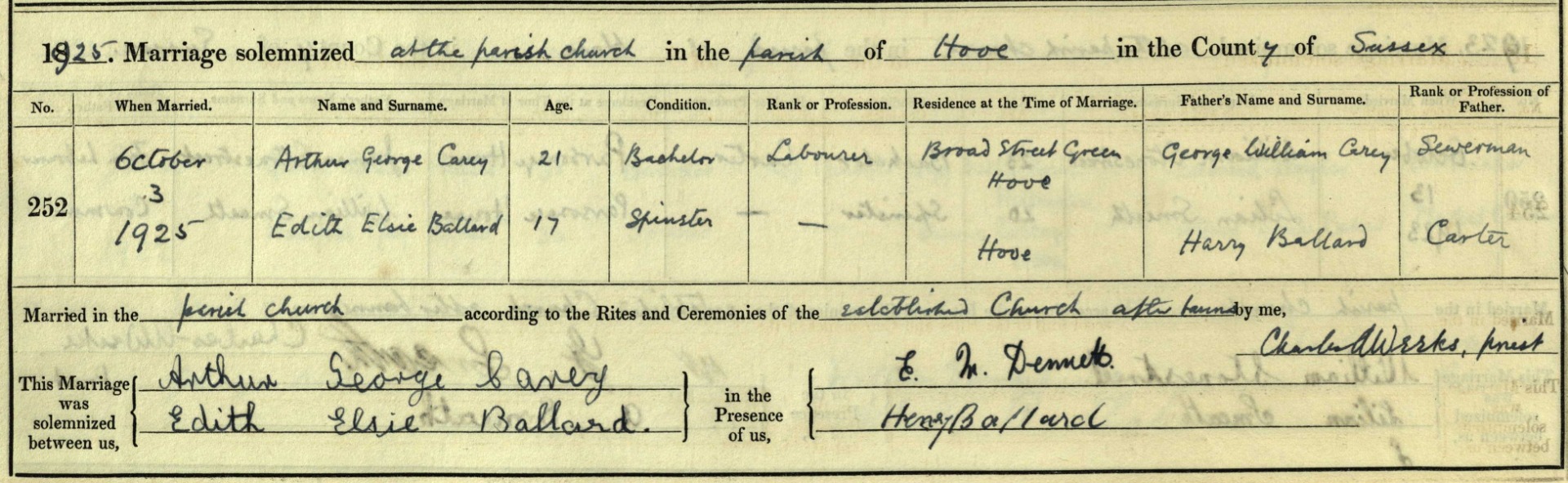 Finally George and Ellen's son Arthur George Carey married Elsie Edith Ballard on 3 October 1925 in Hooe. Arthur is a 21 year old labourer, son of George William Carey, sewer man. Edith Elsie Ballard of Hooe was 17 years old, daughter of Henry Ballard, carter.