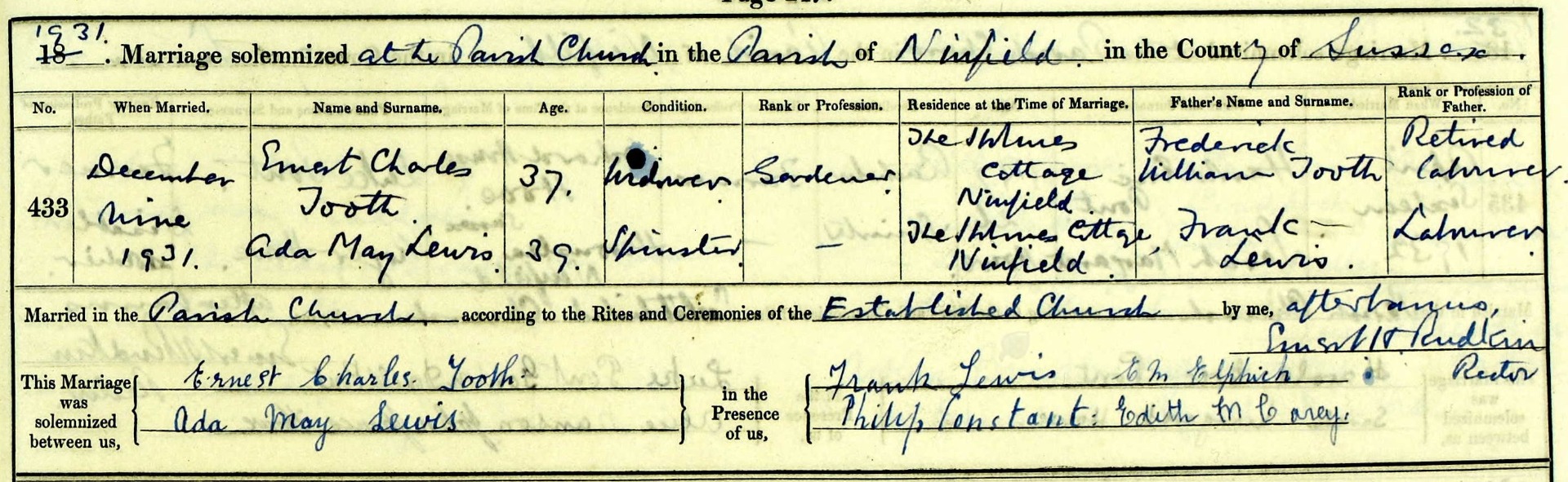Frank and Mary's daughter Ada May Lewis married Ernest Charles Tooth on 9 December 1931 in Ninfield. Ernest was a 37 year old widower, a gardener, the son of Frederick William Tooth, retired labourer. Ada was a 39 year old spinster, daughter of Frank Lewis, labourer.
